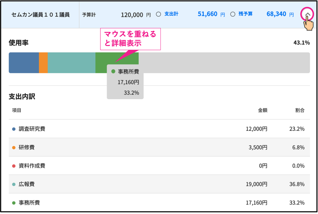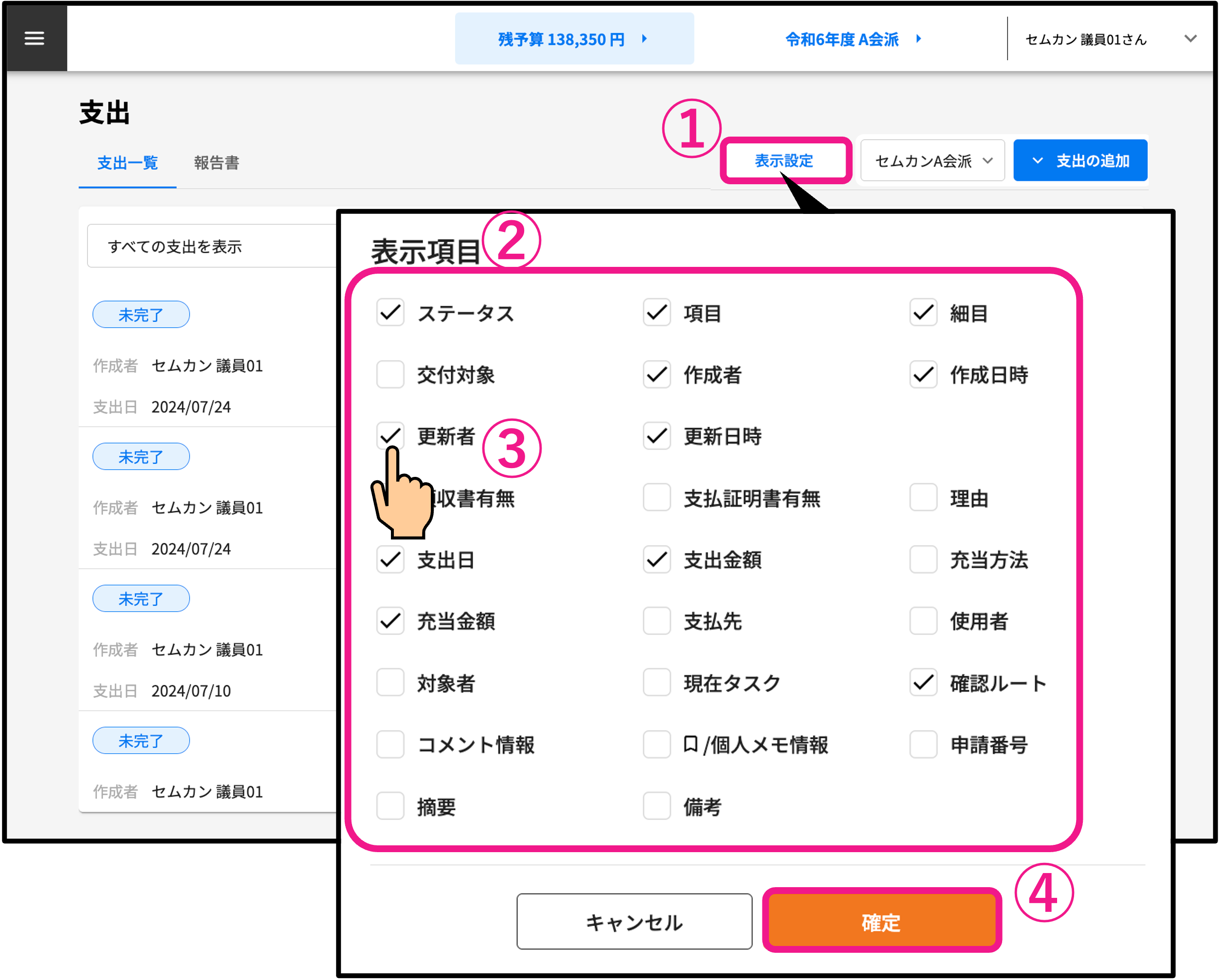 アップデートにより、支出・予算一覧の表示項目をすべて自由にカスタマイズできるようになりました。従来は「ステータス」から「更新日時」まで固定でしたが、今回からは必要な項目だけを選んで表示・非表示を切り替えられます。これにより、用途に合わせた柔軟で見やすい一覧表示が可能になりました。